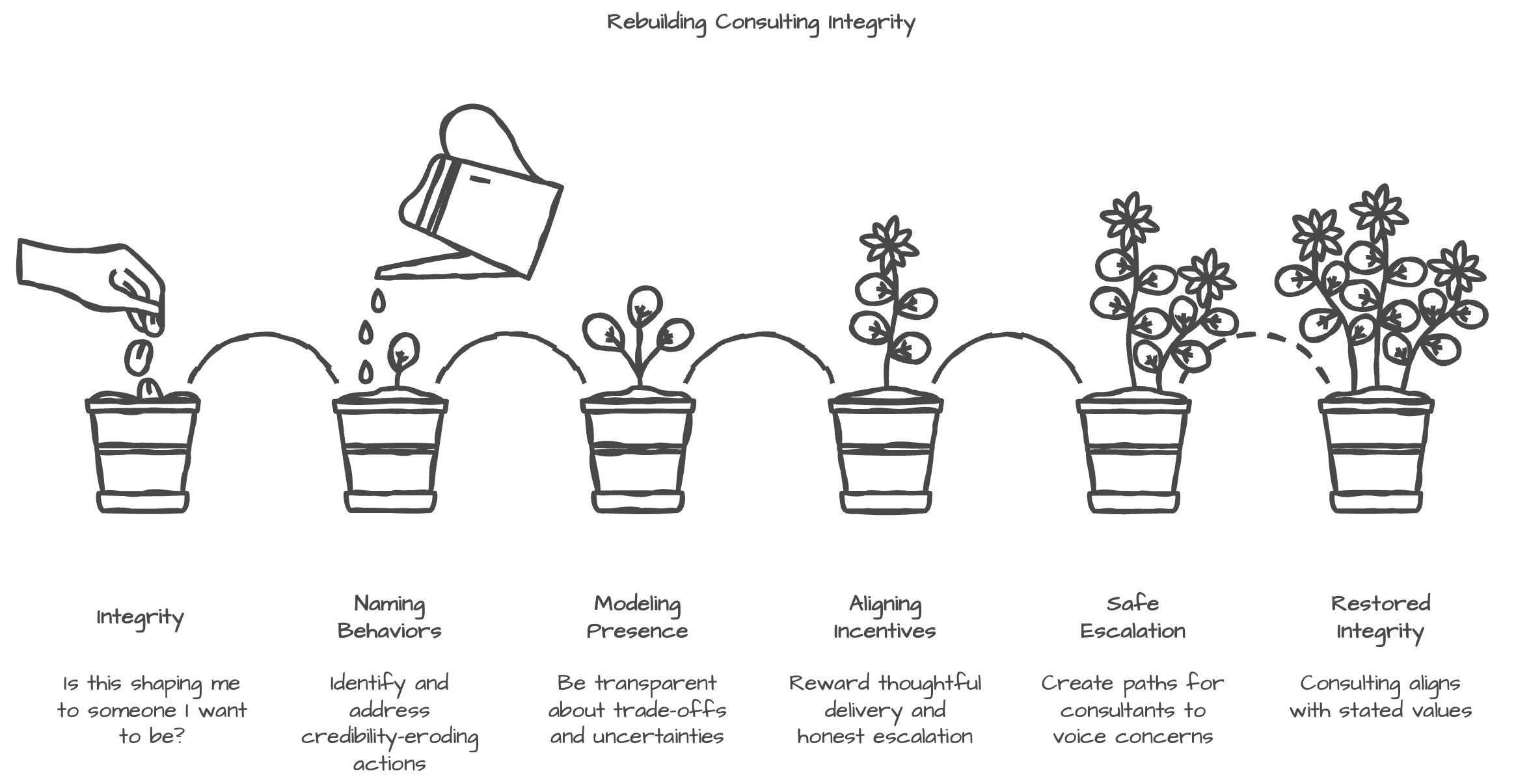 Repairing trust does not require grand gestures. It requires disciplined attention to the small things. Leaders can start by naming behaviours that feel normal but erode credibility over time. They can model presence rather than performance by being transparent about trade-offs and uncertainties during client conversations. Incentives matter too. Rewarding thoughtful delivery, honest escalation and meaningful outcomes sends a clearer signal than rewarding visible busyness or utilisation metrics alone. A simple test often helps.