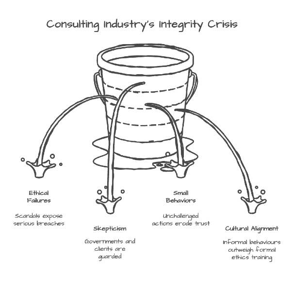 The real problem is not confined to the obvious breaches that make headlines. Those moments are usually the final act. Trust erodes much earlier, inside the day to day rhythms of consulting work, in small behaviours that go unchallenged, feel normal and are absorbed by early-career consultants before they even have the language to question them. Anyone who has sat through onboarding sessions on ethics, utilisation targets or time recording will recognise how quickly informal advice can outweigh formal training.